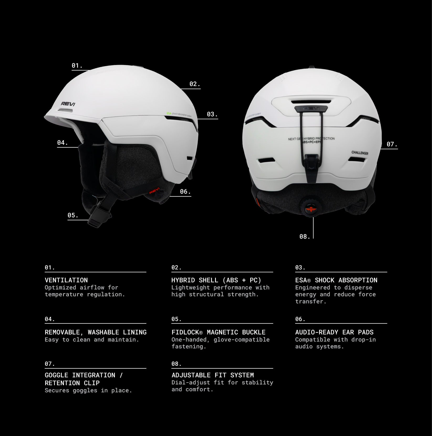 At the core of every Revi helmet is ESA® Protection, an integrated impact-management system engineered to absorb and disperse energy across its structure. But protection alone wasn’t enough. We refused to compromise on fit, feel, or the small details that make you actually want to wear it.