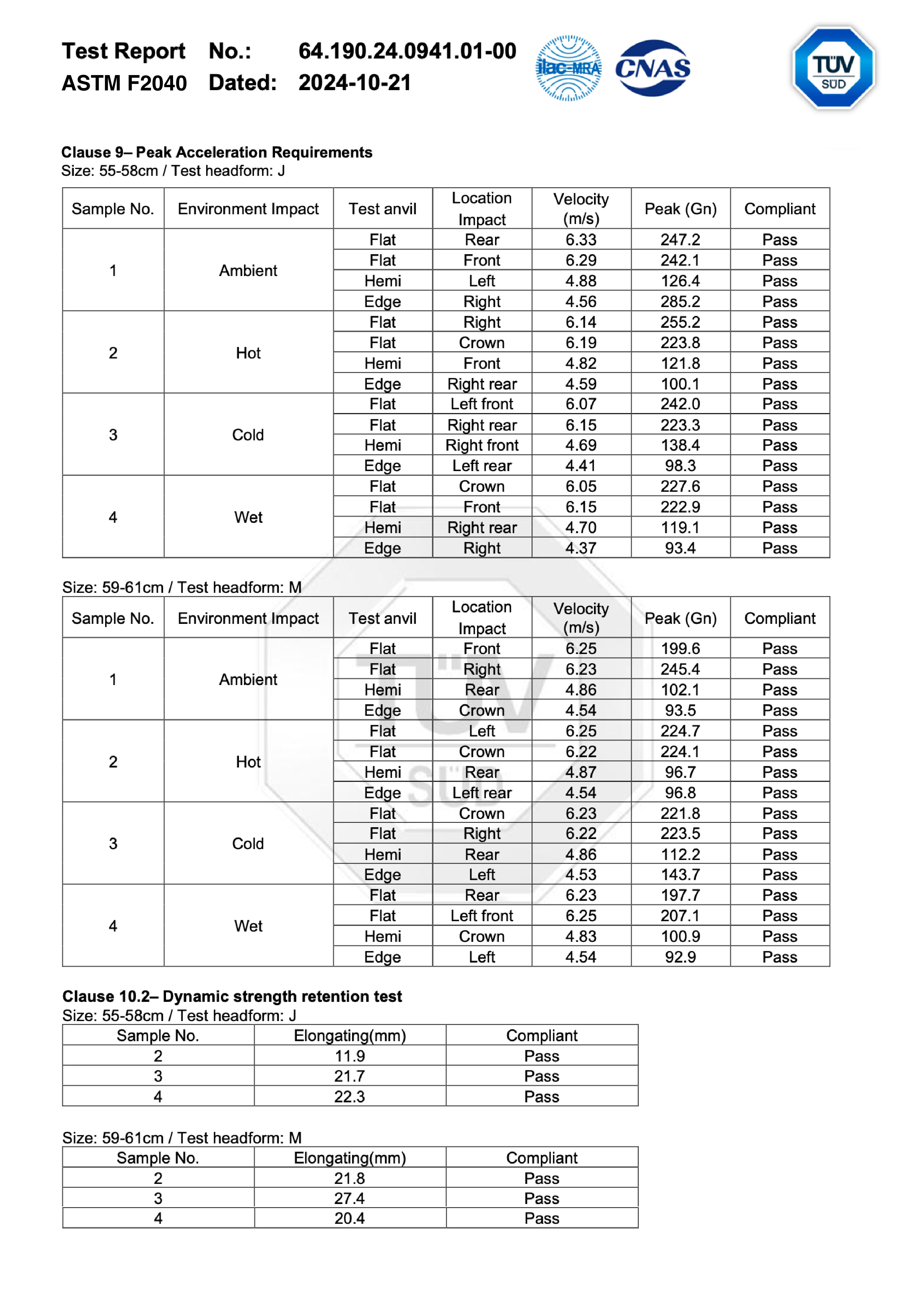 ASTM F2040 Peak Acceleration Requirements Test Results