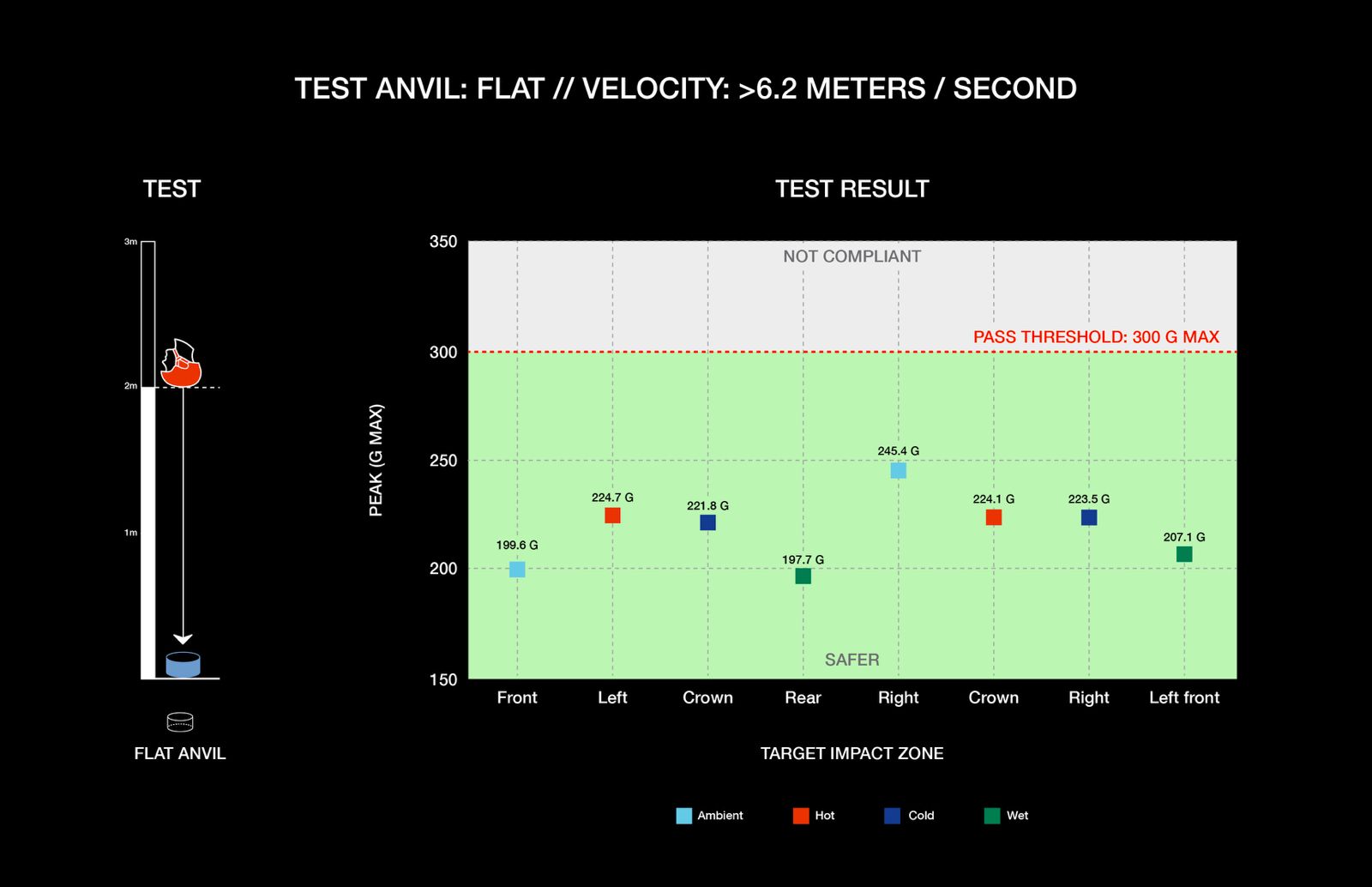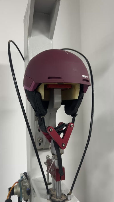 Helmets are dropped onto steel anvils at controlled velocities to measure how effectively they attenuate impact energy. Sensors inside a test headform record peak linear acceleration (measured in g forces), verifying that the helmet keeps impact forces below the maximum limits specified by safety standards.